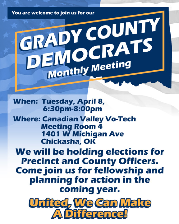 | UPCOMING EVENTS: FEBRUARY 11 - MONTHLY MEETING, 6:30 PM @ Canadian Valley Vo-Tech, Meeting Room 4, Chickasha, OK MARCH 11 - MONTHLY MEETING, Speaker will be Jenna Nelson, 6:30 PM @ Canadian Valley Vo-Tech, Meeting Room 4, Chickasha, OK APRIL 8 - MONTHLY MEETING, Precinct & County Officer Elections, 6:30 PM @ Canadian Valley Vo-Tech, Meeting Room 4, Chickasha, OK MAY 13 - MONTHLY MEETING, Speaker will be OK State Rep. Jared Deck, 6:30 PM @ Canadian Valley Vo-Tech, Meeting Room 4, Chickasha, OK |